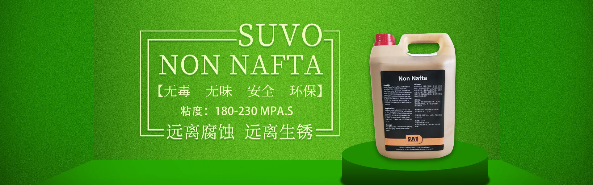 SUVO Non Nafta 是一款無毒、無味、安全、環(huán)保的油基/蠟基防銹產(chǎn)品,不含溶劑,內(nèi)含超強(qiáng)的防腐劑。 涂刷本產(chǎn)品后,會(huì)在被保護(hù)的工件表面形成一層80-100微米厚的油脂、蠟基保護(hù)膜,保護(hù)金屬產(chǎn)品免受惡劣環(huán)境侵害,遠(yuǎn)離腐蝕,遠(yuǎn)離生銹。 產(chǎn)品適合于鋼鐵制品在陸地存儲或海上運(yùn)輸過程中的長期防腐,防銹。本產(chǎn)品非常易于被石油精/煤油清洗劑清除,清洗過程不損傷工件表面,不污染施工環(huán)境。